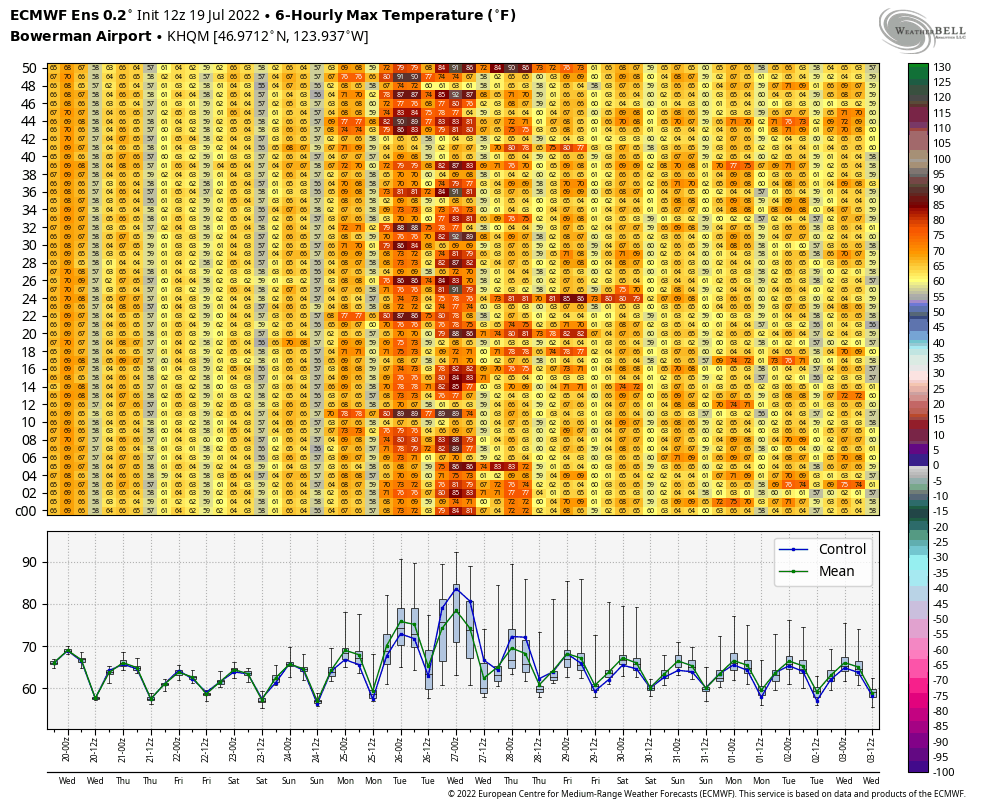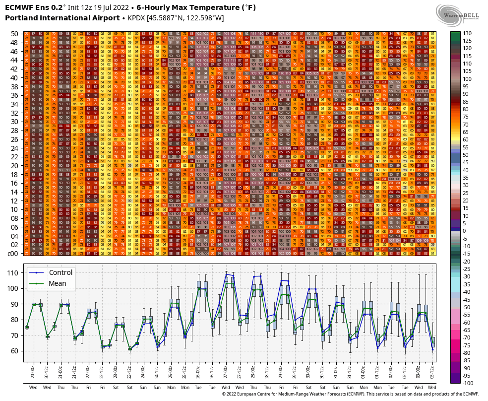 Portland looks to be really hot if the ECMWF forecasts are to be believed. Monday, Tuesday, and Wednesday all look to approach or exceed 100°F. Tuesday looks especially hot, with many ensemble members about 105°F.