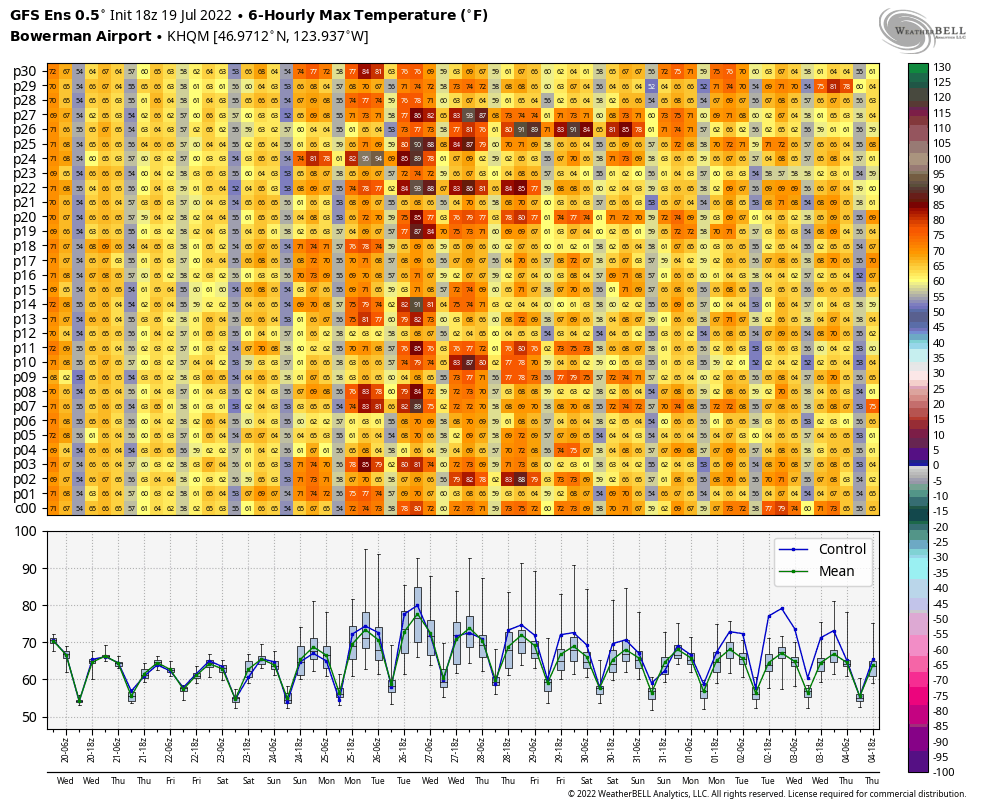Hoquiam, on the Pacific Coast, is a bit more interesting. The ensemble mean (green line in the lower panel) shows only two days of potential warmth (80s), next Monday and Tuesday. A number of ensemble members show temperatures staying in the 70s for the entire heat wave.