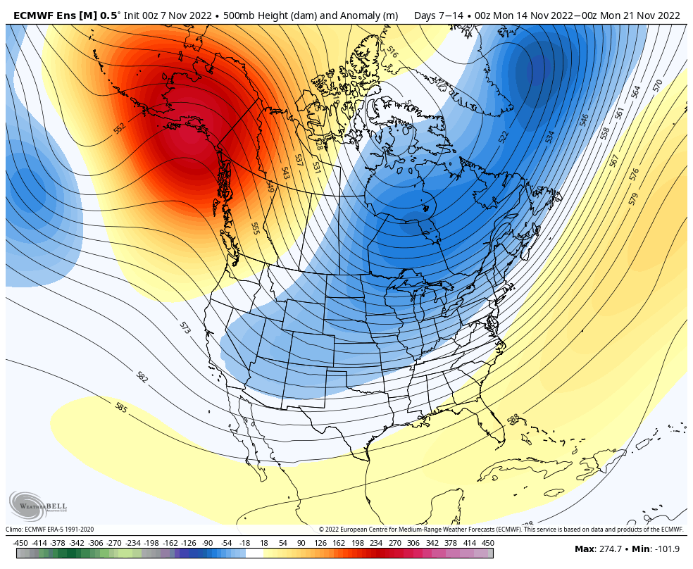 The ensemble mean height forecast for the third week of November showed a familiar sight from summer — a blocking ridge along the west coast of North America.