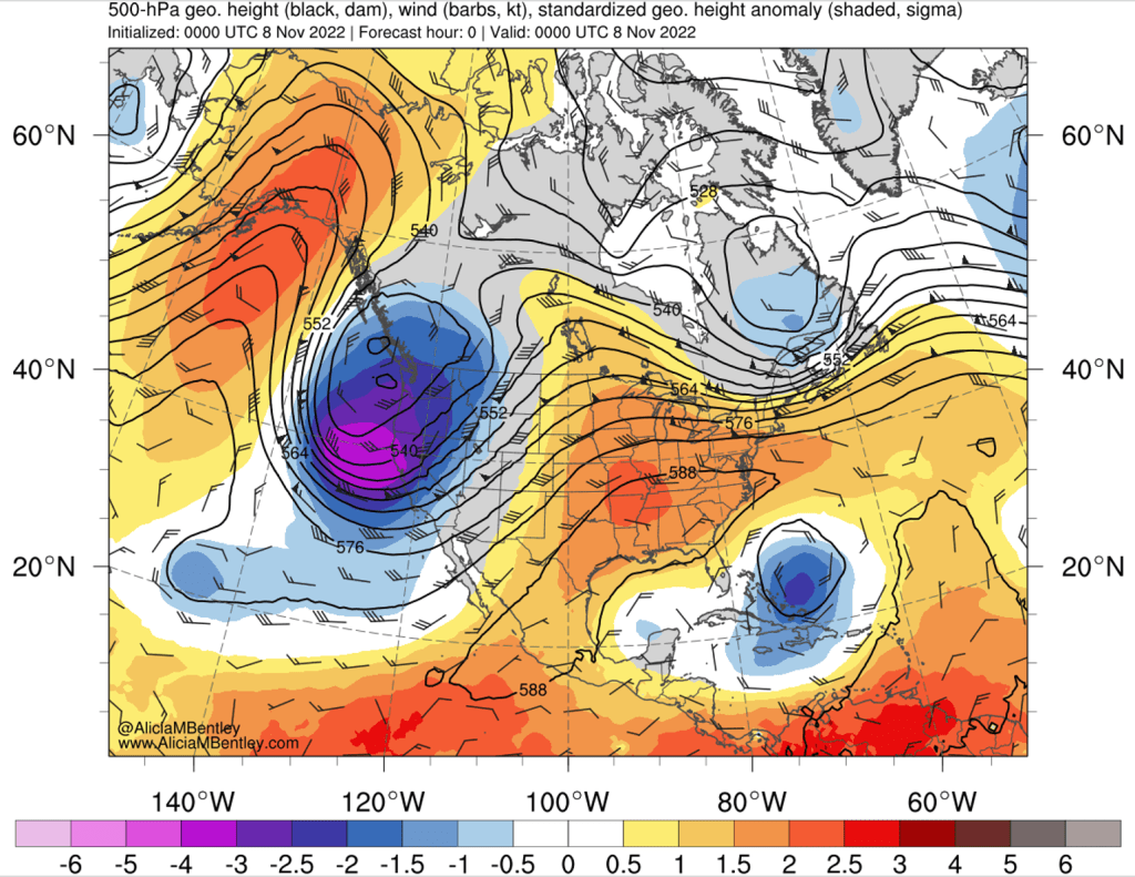 The blues and purples on the 500 hPa anomaly map were just as pleasing to the eyes, especially after several months of persistent yellows and oranges associated with ridging.