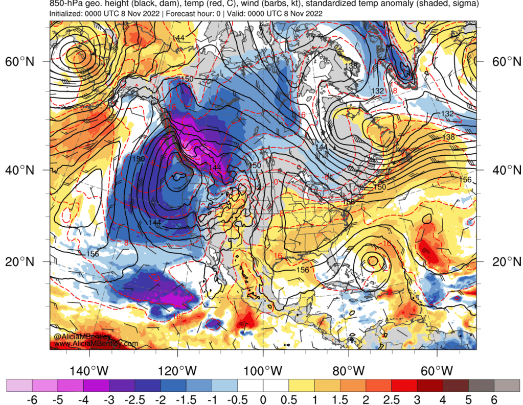 While the coldest anomalies are over land, a significant stream of cold air has also spread across a broad swath of the northeast Pacific ocean.