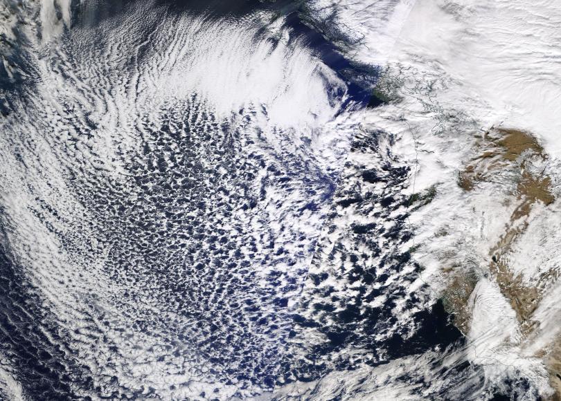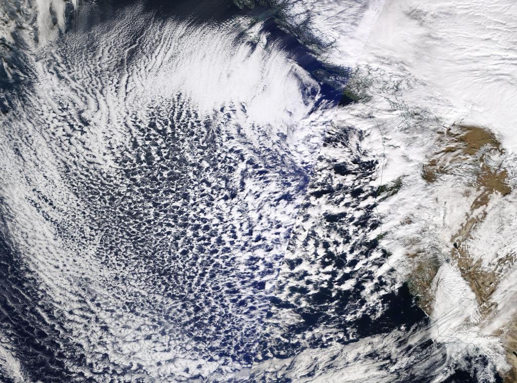 The cellular convective activity over the northeast Pacific was a result of cold air of arctic origins flowing over ocean waters that remain above normal after an unusually warm early autumn.