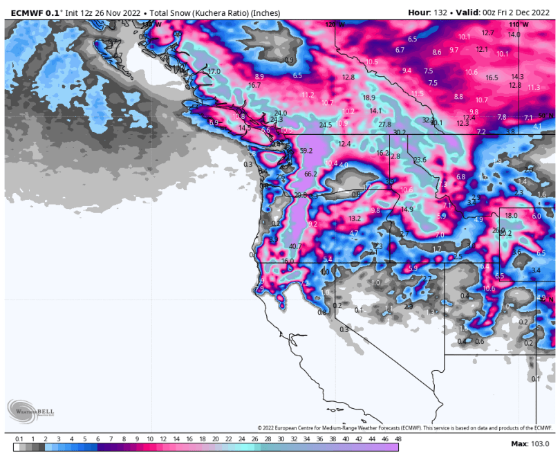 The mountains will get absolutely hammered from this storm cycle — both on Saturday night into Sunday as well as Tuesday into Wednesday. Several feet is expected to fall at the passes. Travel impacts will be significant.