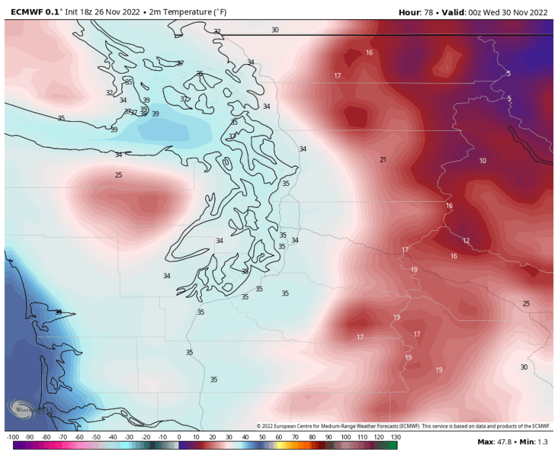 Note the plentiful supply of cold air in eastern Washington, as well as the slightly colder temperatures in Whatcom and Skagit Counties. Locations in proximity to the colder air — near the passes and the Canadian border — are the most likely to see appreciable accumulations from this storm.