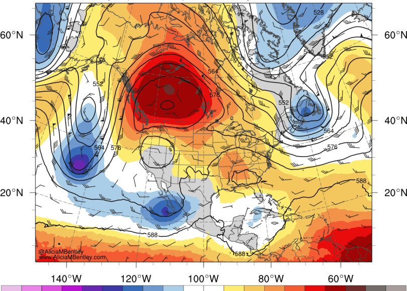 By Sunday, a giant area of +3 sigma height anomalies will cover most of BC, Alberta, and Saskatchewan.