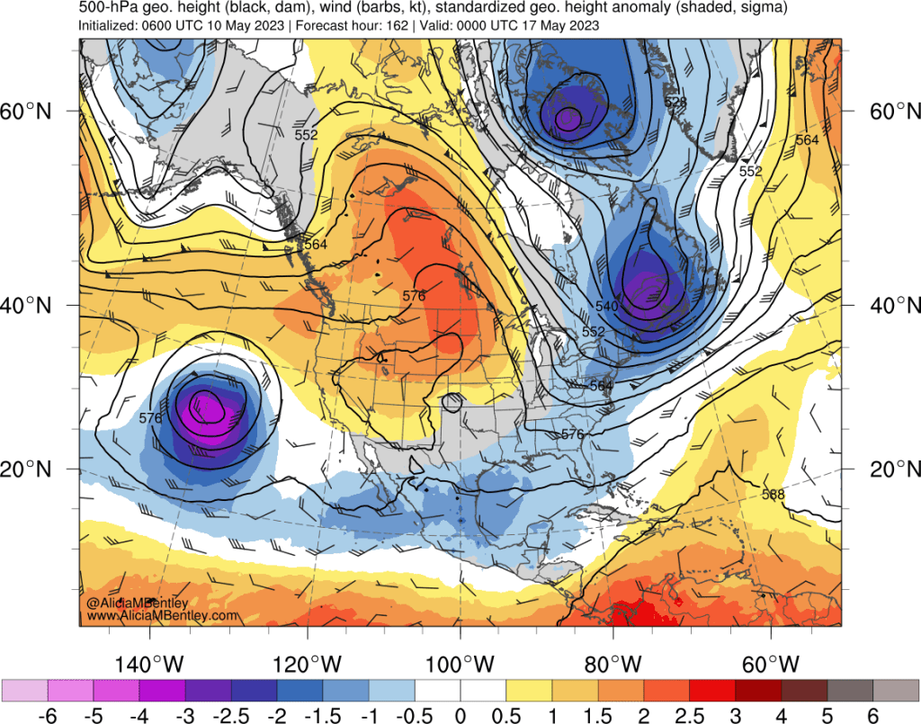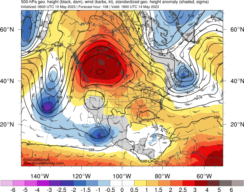 The above forecast looks remarkably like the infamous June 2021 heat wave. The 2023 version has similar anomalies, but the absolute height values are lower because this event is occurring earlier in the season.