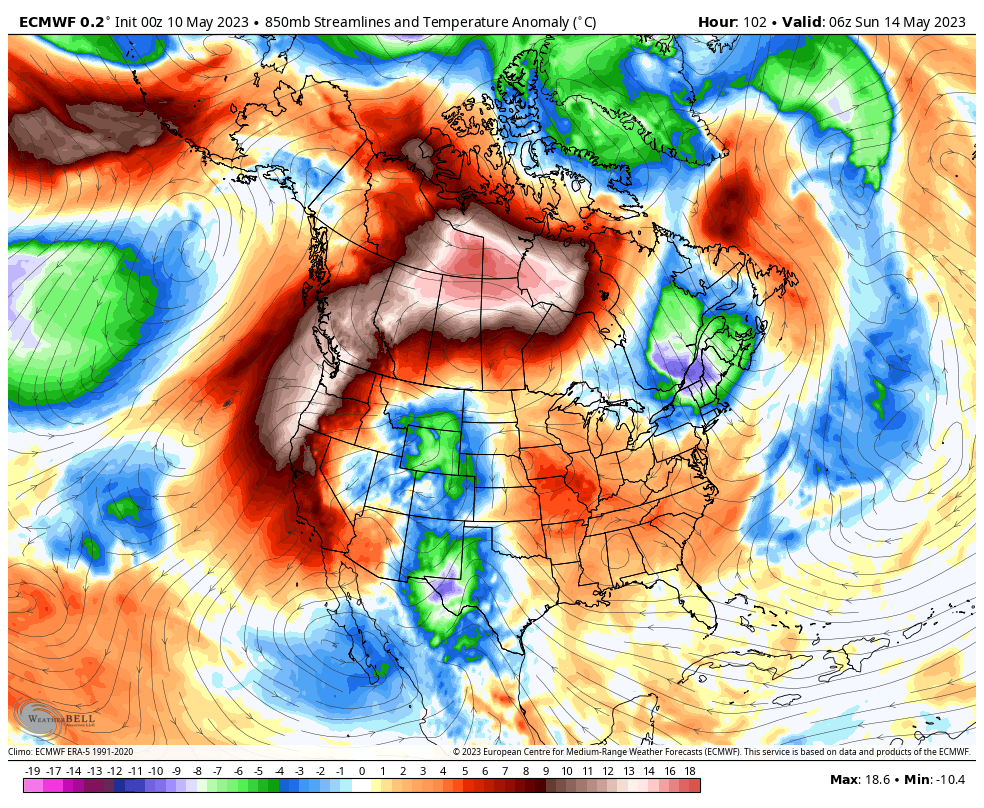 If this pattern was occurring in late June instead of mid-May, I have no doubt that we would be talking about the potential for 100s in Seattle and Portland. Fortunately, this ridge is expected to pull some cooler air down into the northern Rockies on Friday and Saturday, which will limit the potential for maximum temperatures to the upper-80s to low-90s in most of the lowlands.