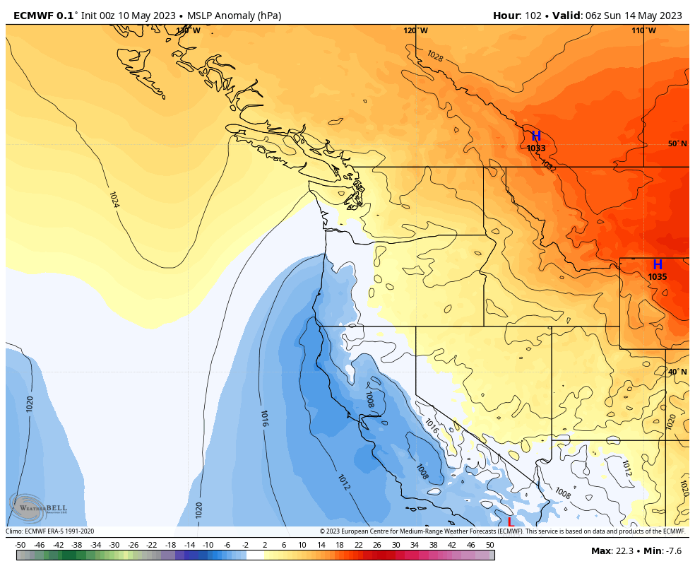Temperature anomalies will be the greatest to the west of the Cascades thanks to impressive downslope warming from the strong easterlies to the south of the ridge. The downslope warming is largely the driver of this heatwave in our region, as is necessary in the early season when ambient temperatures are still relatively cool compared with summer.