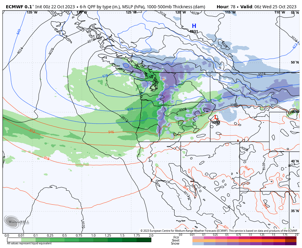 The shortwave trough depicted above (as blues and purples over the PNW) is expected to amplify over the region from Tuesday night into Wednesday. This system will bring cold air from two directions — a modified cold and moist airmass from the Pacific Ocean and an even colder continental airmass from interior British Columbia and Alberta.