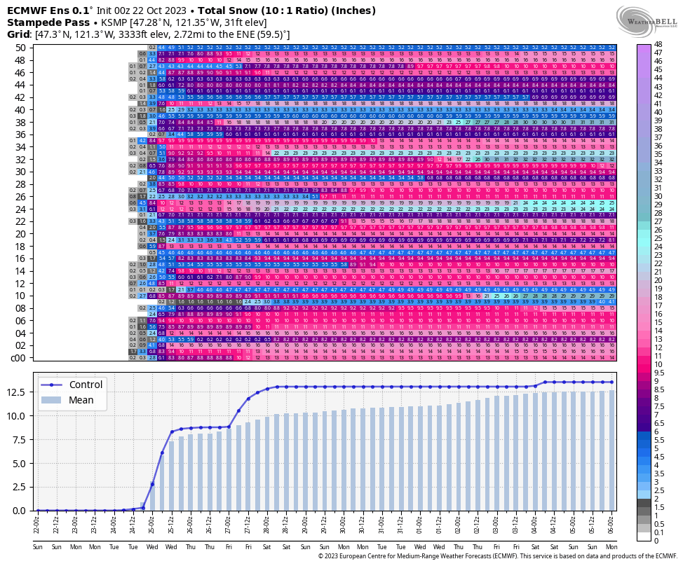 The ECMWF ensemble suggests that 6 or more inches of snow is fairly likely at Stampede / Snoqualmie Passes on Tuesday night with a lesser chance of additional snow later in the week.