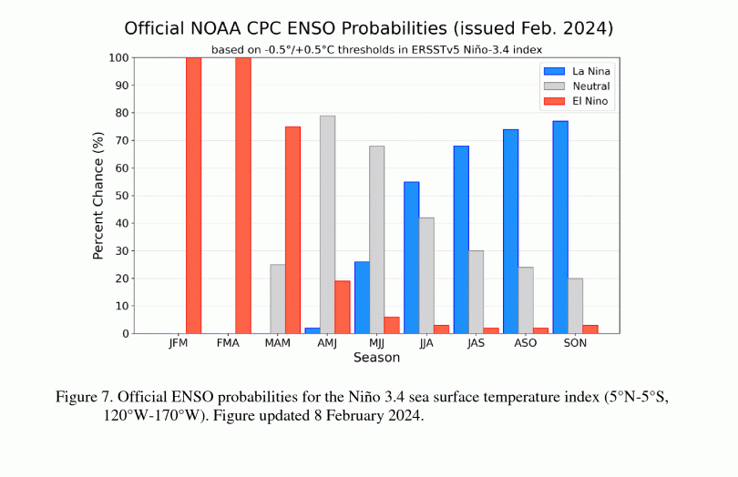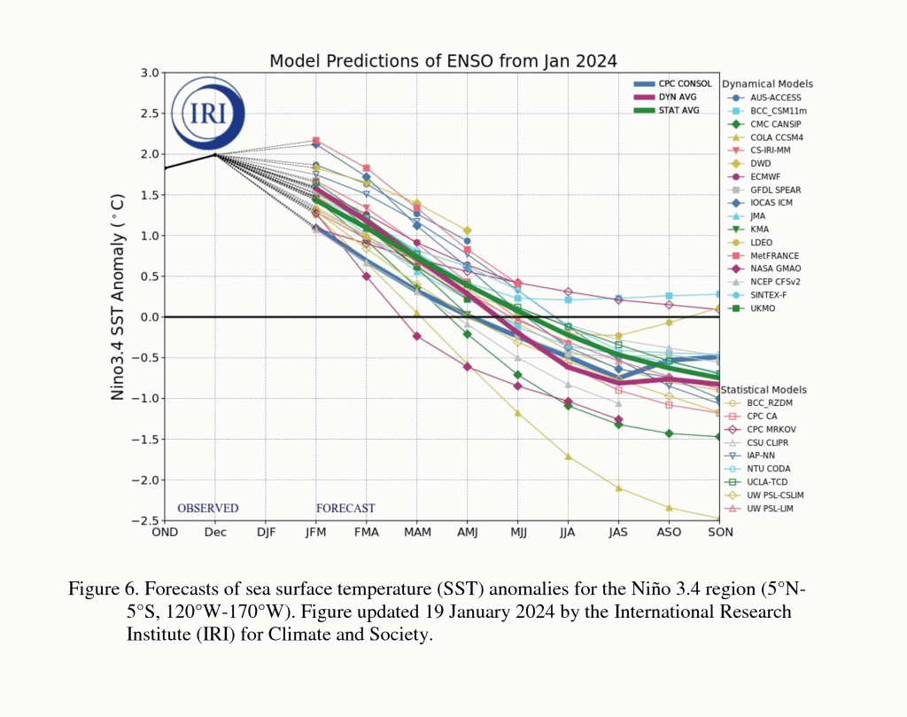 While surface ocean temperatures in the equatorial Pacific remain warm, sub-surface anomalies have begun to cool off, an early sign that El Niño is waning. Additionally, most models predict that the ENSO index will drop to neutral by summer and into La Niña territory by fall.