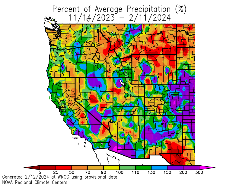 Precipitation over the last 90 days has been well below normal, which is contributing to the snowfall deficits, especially in Montana.