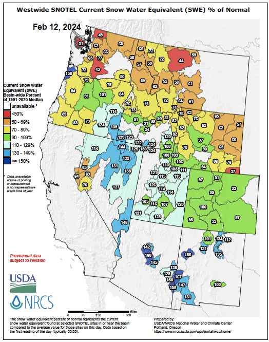 It is no surprise that snowpack this winter is running far below normal in Washington, northern Idaho, and Montana. The situation is generally better the farther south one looks, except for the Sierra Nevada.