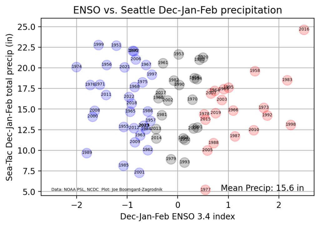 Interestingly, precipitation in Seattle has almost no correlation with the ENSO index. Sea-Tac has recorded around 13 inches of precipitation since December 1 as of this writing, which is slightly below normal.