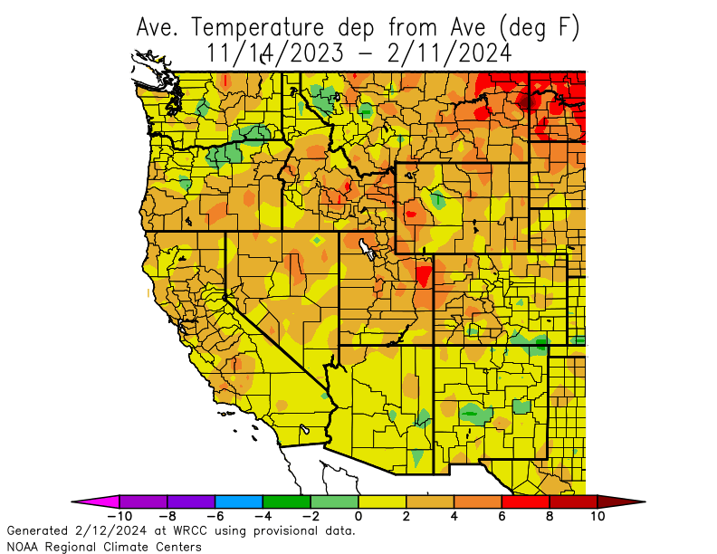 Temperatures over the past 90 days have been running near or above average nearly everywhere in the western US, which seems to be the case more often than not in recent years. Other parts of the US have been running more extreme warm anomalies this winter.