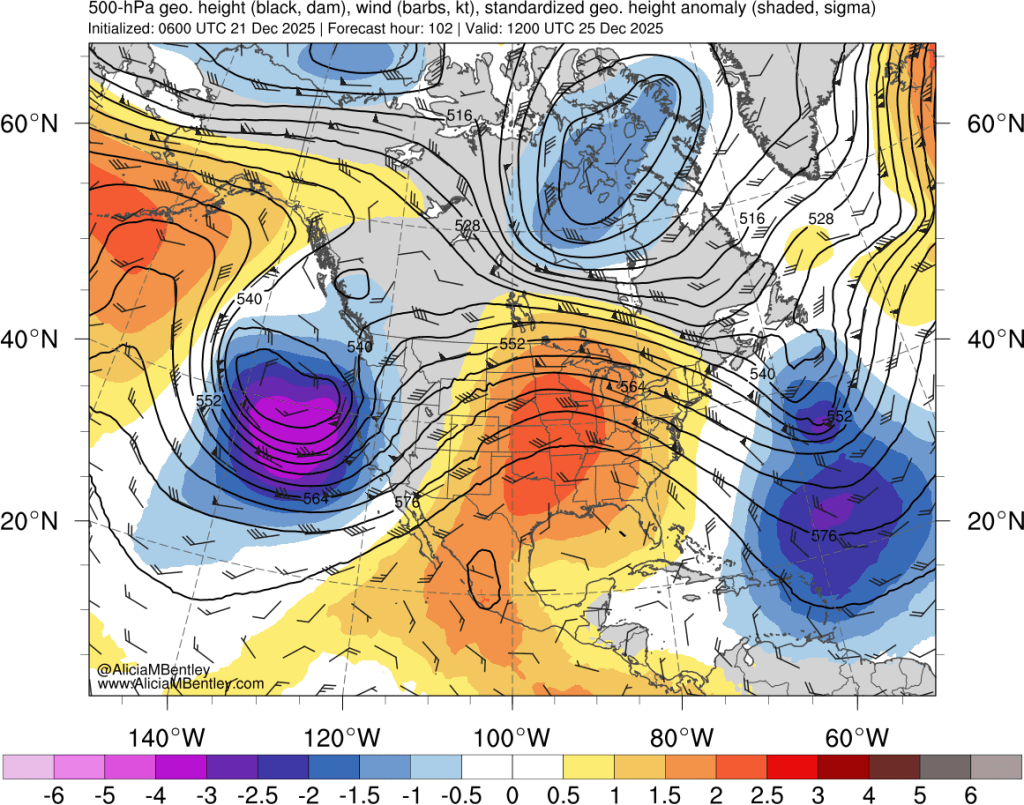 Surface temperatures will exceed 30°F above normal in the central US on Christmas. Western Washington is one of the few spots in the continental US that will actually be near or below normal.