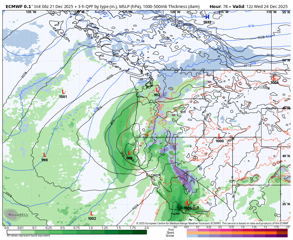 Unfortunately for snow fans, it appears there simply isn’t enough cold air in place to bring the snow level below 1,000 ft, even if the low would take a perfect track. Some of the more favorable tracks could potentially lead to snowflakes at higher elevations and closer to the Canadian border, but lowlands and lower foothills are going to be stuck with rain for Christmas it appears.
