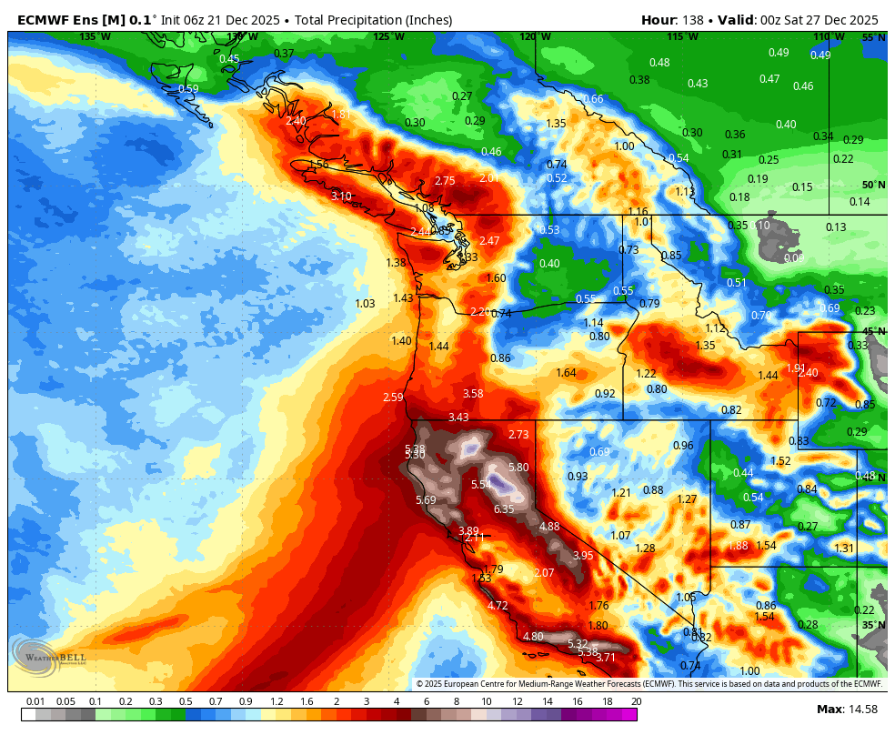 The good news is that the bulk of the atmospheric river action will shift southward to California, while Washington and Oregon will remain active but with lower snow levels. The precipitation forecast for the next week shows only about 1-1.5 inches in Seattle and Portland.