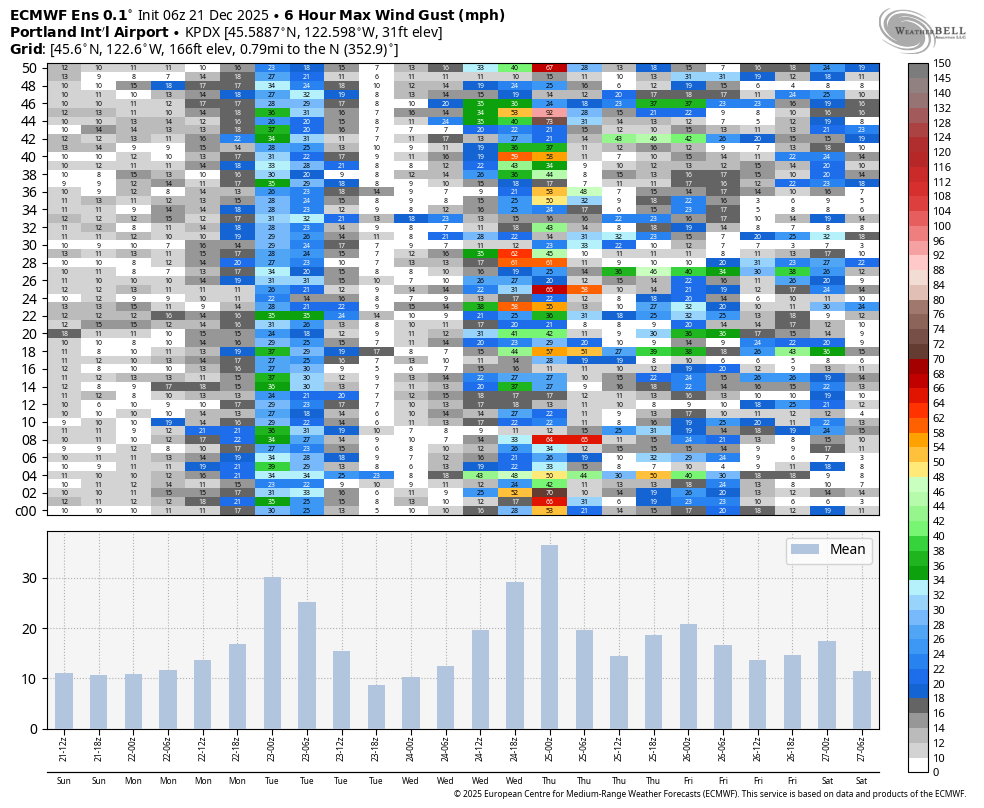 What is the likelihood of such an event occurring? The ECMWF ensemble maximum wind gusts for Portland (PDX) suggest that it’s about 50/50. Many of the ensemble members show almost no wind at all, suggesting high forecast uncertainty.